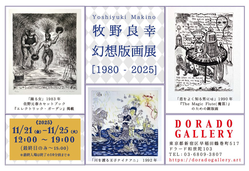 講師の牧野良幸の個展です。過去45年に製作した銅版画から幻想的な作品を選んで展示します。