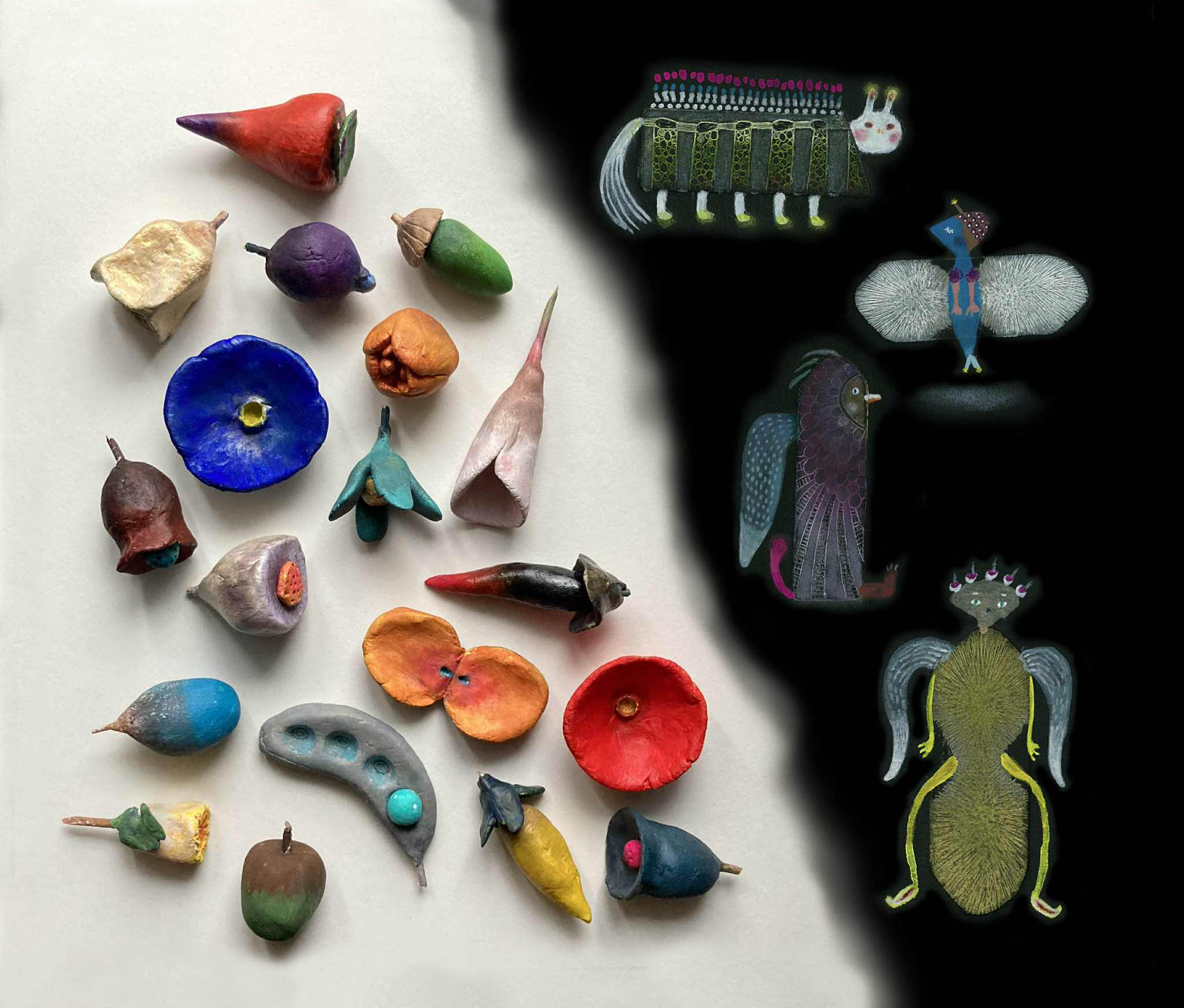 銅版画、ペン画、粘土作品などを展示します。