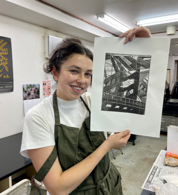 短期体験コースで、デンマークから交換留学生として来日しているA.D.さんが銅版画を制作しました。